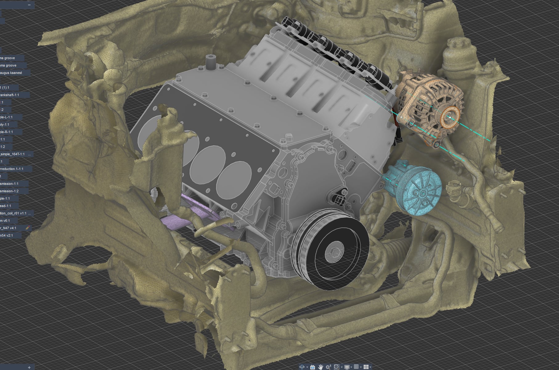 Võistlussõiduki originaalmootori asemele paigaldatakse LS V8 ning selleks, et hinnata uue mootori sobivust, 3D-skaneerisime sõiduki mootoriruumi ning valitud mootorikomponendid. Saadud andmete põhjal saame CAD-tarkvaras digitaalse mudeli üles ehitada, katsetada erinevaid lahendusi ja veenduda juba enne füüsilist paigaldust, et uus mootor mahub oma kohale ja rihmalt töötavad lisaseadmed joonduvad korralikult.